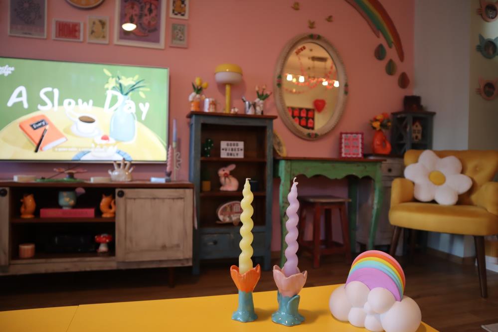 “Arkadaşlarım ve eve ilk gelen misafirler genelde ‘Bu ev çok mutluluk veriyor, huzur veriyor’ diyorlar. Renkleri çok sevdiğim için bu köşe de benim için çok önemli, çok sevdiğim bir köşe. ‘Gökkuşağının altındaki altınlar’ efsanesi vardır ve o altınları bulunca insanın mutluluğa ulaştığına inanılır. Benim de buradaki gökkuşağımın altında altınlar var; yanında da çizgi film karakteri olan Varyemez Amca var, altınları koruması için onu görevlendirdim, bu köşenin böyle bir hikayesi var.”